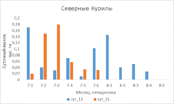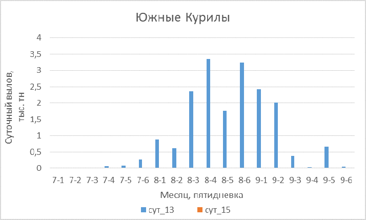 В настоящее время отмечены подходы горбуши к побережью Южных Курил (о. Итуруп), что, в целом, соответствует ожидаемой динамике, хотя интенсивность лова ниже предполагаемой. В данном районе подходы горбуши наиболее поздние во всем Сахалинском регионе. В соответствие с представленной диаграммой, повышение уловов ожидается в первой декаде августа, наибольшие уловы будут во второй половине августа. Итоговая величина уловов будет близка к прогнозной.