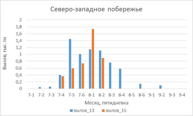 Рисунок 6 – Динамика вылова горбуши в прибрежье северных Курил (о-ва Парамушир, Шумшу) в 2013-2015 гг.