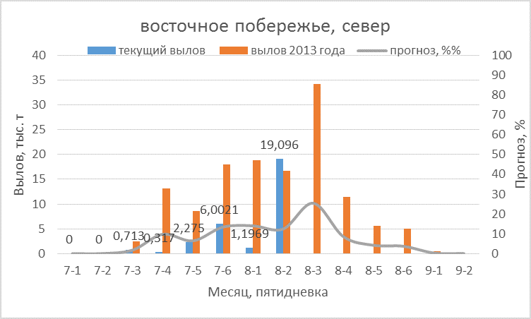 На восточном побережье (на северном участке) отмечено существенное снижение показателей вылова за прошедшую пятидневку. Это связано как с гидрологической и штормовой обстановкой, так и со cменой темпоральных группировок горбуши. Ожидается дальнейшее постепенное снижение уловов на данном участке до конца августа.