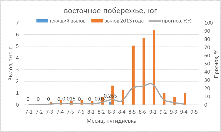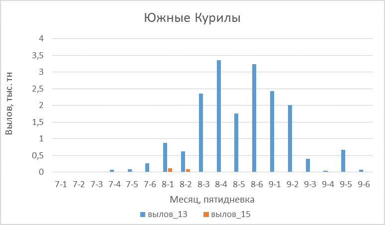 В настоящее время отмечены подходы горбуши к побережью Южных Курил (о. Итуруп), что, в целом, соответствует ожидаемой динамике, хотя интенсивность лова ниже предполагаемой. В данном районе подходы горбуши наиболее поздние во всем Сахалинском регионе. В соответствие с представленной диаграммой, повышение уловов ожидается в первой декаде августа, наибольшие уловы будут во второй половине августа. Итоговая величина уловов будет близка к прогнозной.