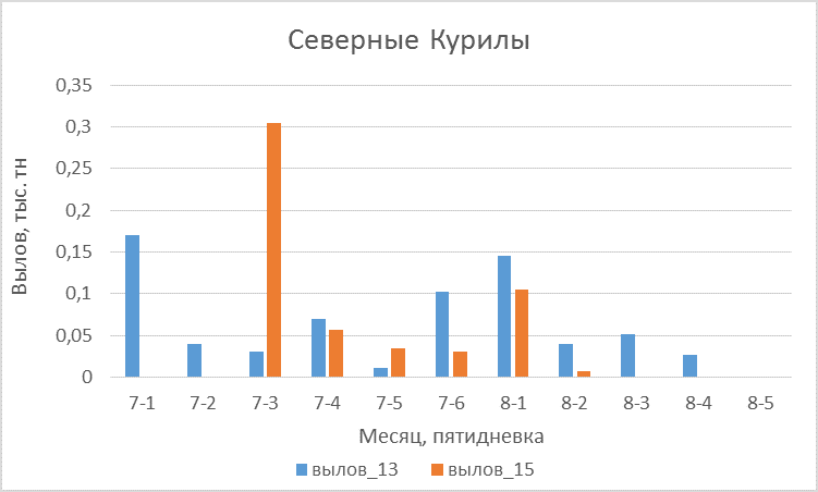 На Северных Курилах произошло ожидаемое снижение интенсивности уловов горбуши, во второй половине августа ожидается дальнейшее уменьшение показателей вылова. Общая величина вылова, вероятно, составит около 1 тыс. тонн.
