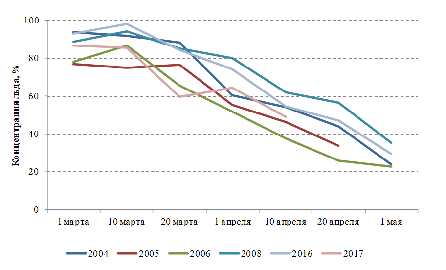Рисунок 1 – Динамика суточных уловов минтая у северо-восточного Сахалина в 2011-2016 гг. В целом, имеются немалые основания предполагать, что во вторую половину апреля 2017 г. ход промысла минтая у северо-восточного Сахалина будет развиваться по аналогичному сценарию последних трех лет. На это же указывает и промысловая статистика добычи этой рыбы в марте - первой половине апреля. Так, если в последних числах марта суточный вылов минтая составлял всего 300-500 т, а на лову находилось от 2 до 5 судов, то уже в первую декаду апреля с подходом новых рыбодобывающих единиц наблюдался поступательный рост уловов. Начиная с 10 апреля число промысловых судов в этом районе достигло 15-18 единиц, а суточные уловы значительно выросли и составляли от 900,0 до 1610 тонн. Общий вылов минтая на 16 апреля составил более 20,0 тыс. тонн. Приведенные данные позволяют полагать, что во вторую половину апреля уловы минтая у северо-восточного Сахалина останутся как минимум на уровне 1000-1500 тонн в сутки. В случае подхода дополнительного количества рыбодобывающих судов суточные уловы могут возрасти и до 2000 тонн. Естественно, что в переходный сезонный период на промысловую обстановку в отдельные дни будут оказывать влияние активная циклоническая деятельность (сильные шторма). Определенные осложнения на добыче минтая в эти весенние месяцы будут связаны и с непростой ледовой обстановкой, которая ежегодно формируется в этой холодноводной части Охотского моря. В апреле большее число судов, очевидно, будет работать на добыче в самой северной части района, между 53 и 55 град. с.ш. Ближе к концу апреля и в мае промысловые суда будут иметь возможность облавливать преднерестовые и нерестовые скопления минтая, формирующиеся к югу от 53 град. с.ш., вплоть до 51 град. с.ш. На основе спутниковой информации, полученной станцией TeraScan с 2004 по 2017 гг., были проанализированы данные по динамике концентрации льда у северо-восточного побережья Сахалина. Согласно данным по ряду лет, представленным на рисунке 2, с начала апреля в заданном районе происходит процесс постепенного таяния льда. В апреле 2017 года динамика таяния льда аналогична ситуации, наблюдаемой в 2004–2006 гг., 2008 и 2016 гг., когда в течение апреля концентрации льда снизилась до 20–35%, и ледовая обстановка была благоприятной для промысла минтая.