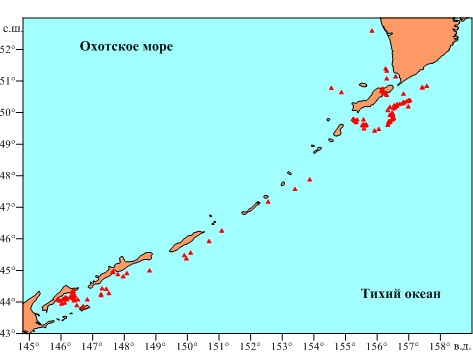 В настоящее время из-за сложной ледовой обстановки судовой экспедиционный промысел в Восточно-Сахалинской подзоне Охотского моря не ведётся. Добыча рыб осуществляется в районе северных и южных Курильских островов. Основной промысловый объект, на который направлено внимание добывающих предприятий в настоящее время – минтай. Его лов осуществляют суда, оснащенные разноглубинными тралами и снюрреводами. На рисунке 2 представлено распределение флота на промысле минтая в период 21-28 февраля. В это время добычей минтая в Тихоокеанской подзоне Северо-Курильской зоны занимались 1 крупнотоннажное, 11 среднетоннажных и 7 малотоннажных судов. Вылов на судосутки достигал: КТФ – 86, СТФ – 60, МТФ – 24 тонны. В Южно-Курильской зоне добычу минтая производили 9 среднетоннажных и 4 малотоннажных судна. Вылов на судосутки достигал: СТФ – 77, МТФ – 11 тонн.
